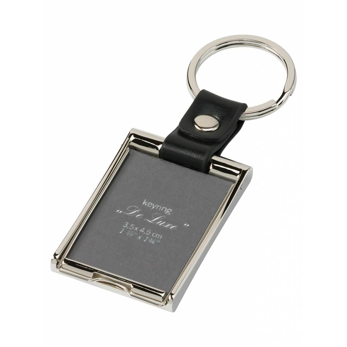 Schlüsselanhänger De Luxe Schlüsselanhänger mit Metallrahmen am Kunstlederband mit Kunststoffscheibe für ein Passbild im Format 3,5x4,5 cm in rechteckiger Form mit Metallring. Farben: schwarz Verpackung: einzeln im Poly-Beutel.