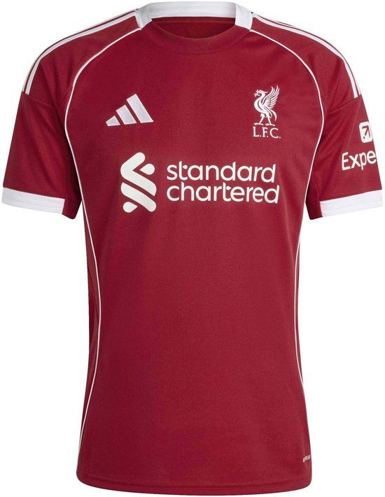 Kleur: Aardbeirood. Samenstelling: 100% gerecycled polyester. Mouwen: Kort. Halslijn: Ronde hals. Pasvorm: Slim Fit. Details: Liverpool FC-logo geborduurd op de borst, contrasterende witte inzetstukken, ademende Aeroready-technologie. Duurzaamheid: Volledig gemaakt van gerecycled polyester om afval en het gebruik van niet-hernieuwbare grondstoffen te verminderen. Gebruik: Officieel Liverpool FC 25/26 thuisshirt, ontworpen voor ondersteuning en vrije tijd.