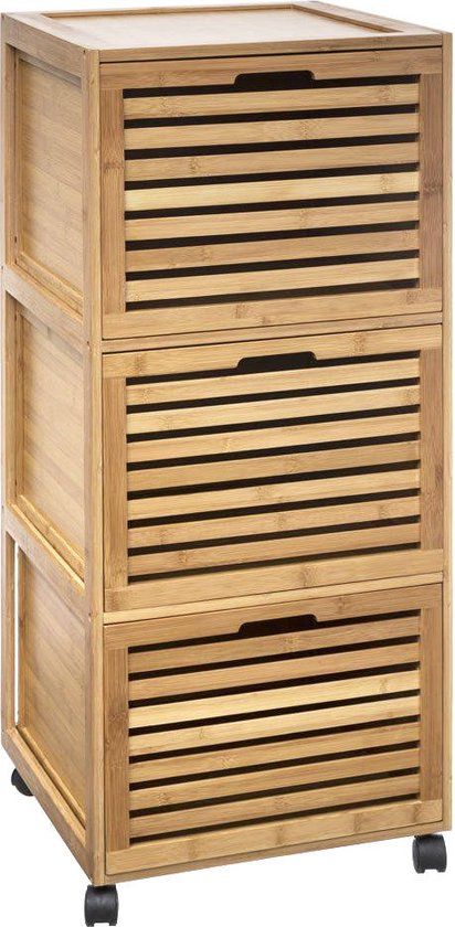 Een kast op wieltjes die gemakkelijk kan worden verplaatst naar andere kamers is een geweldig en ruim meubel voor opslag. De badkamerrek is gemaakt van bamboehout, wat betekent dat het meubel duurzaam en milieuvriendelijk is. Het is dus perfect voor iedereen die houdt van meubels gemaakt van natuurlijke materialen en het milieu een warm hart toedraagt. De rek is een geweldige manier om handdoeken en cosmetica op te bergen in de badkamer. Je kunt overtollig voedsel opbergen in de voorraadkast en er is extra ruimte voor kookgerei in de keuken. De rek heeft 3 ruime lades die veel extra opbergruimte voor spullen van verschillende afmetingen. Een plant in een pot of een decoratief ornament kan op de bovenkant van de kast worden geplaatst, wat de look van de kast mooi aanvult. Dankzij de neutrale vorm en kleur past de rek in elk interieur.