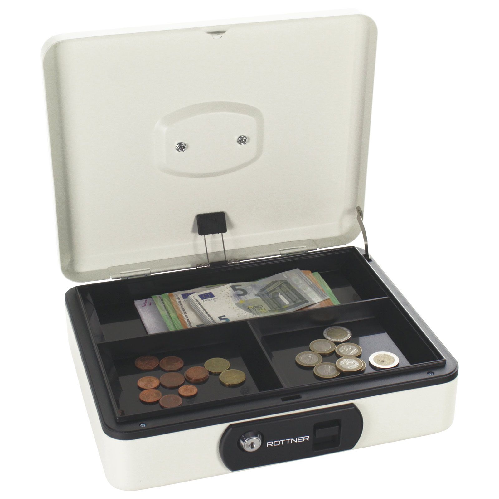 De moderne geldcassette Pro Box Two in de trendkleur wit overtuigt over de hele linie. Het hoofddoel is het overzichtelijk en overzichtelijk opbergen van bankbiljetten en munten in de kassalade. Als je deze verwijdert, komt er een plastic bodem tevoorschijn. Ook te gebruiken voor sierraden of kleiner waardevolle spullen.Aan de bovenzijde bevindt zich een uitschuifbare handgreep waardoor de geldkist gemakkelijk te vervoeren is. Met een simpele druk op de knop opent de cassette automatisch.