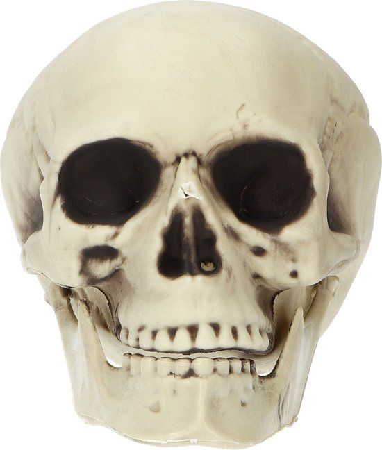 Met het hoofd op tafel. Decoratie - Schedel - Halloween - 14 x 17 x 19 cm. Inhoud: 1 doodshoofd. Bijvoorbeeld te gebruiken tijdens de volgende feestgelegenheid/feestgelegenheden: Halloween, Themafeest. Een doodskop voor op tafel of om het ergens anders extra sfeervol te maken. De schedel is 14 x 17 x 19 cm groot. Dit artikel is gemaakt van plastic.