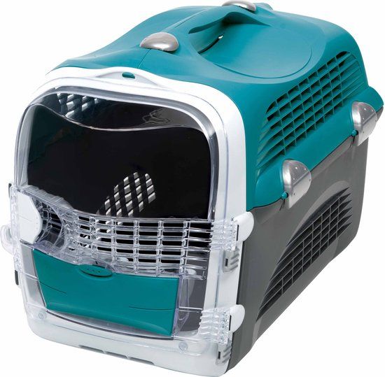 De Catit Cabrio Transportbox is super handig om uw kat overal mee naartoe te vervoeren. Doordat de bovenkant open kan, kunt u uw kat gemakkelijk in de transportbox zetten. Door de transparante voordeur kan uw kat naar buiten kijken en kunt u hem goed zien zitten. In de deur zit tevens een klepje met voerbakjes die gemakkelijk vanuit de buitenkant bereikbaar zijn. Daarnaast is de Catit Cabrio voorzien van een slipvaste bodem met opvanggoot voor als er een ongelukje gebeurt onderweg of als hij iets morst. De optimale luchtstroom en ventilatie zorgt voor een comfortabele reis. Het handige sluitmechanisme voorkomt dat uw kat de box van binnenuit kan openmaken. De Catit Cabrio Transportbox kan een maximaal gewicht van 11,3 kg en hoogte van 35 cm aan.