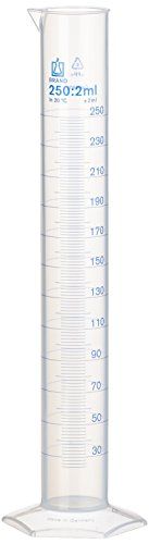 Maatcilinder klasse B van doorschijnend PP met blauw bedrukte schaal Met zeskantvoet. Volgens DIN 12 681 en ISO 6706 Met schenktuit Gegradueerd