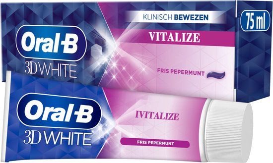 Vertrouw je mond toe aan de whitening expertise van Oral-B 3D White vitaliserende munt whitening tandpasta. 3D White vitaliserende munt tandpasta is 3 voordelen in 1 tandpasta, die je tanden witter en sterker maakt, en beschermt. De glazuurveilige formule verwijdert zachtjes de vlekken van het tandoppervlak, zodat een mooie witte lach onthuld wordt en de vitaliserende muntsmaak je een verjongend fris gevoel geeft.