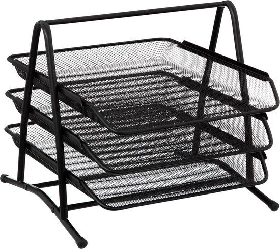 Brievenbak/postbakje voor A4 formaat documenten, sorteer rekje met 3 lagen. Materiaal: draadmetaal. Kleur: zwart. Afmetingen: L30 x B35 x H27 cm.Om uw papier, brieven en post in te sorteren en overzichtelijk te bewaren op kantoor of in uw hobbyruimte. De rekjes zijn individueel uitschuifbaar en uitneembaar.