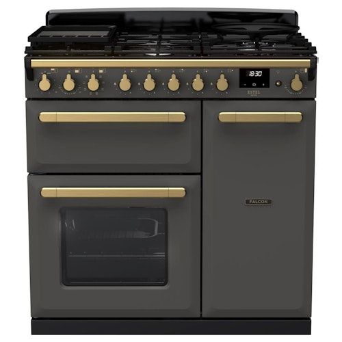 Vrijstaand fornuis gas/elektro Estel deluxe 90 met 5 branders waaronder wokbrander, digitale timer, 1 multifunctionele oven met 7 inzetniveaus, 1 heteluchtoven inhoud 67 liter, grill ruimte, thermischebeveiliging en afwerking antique brass.