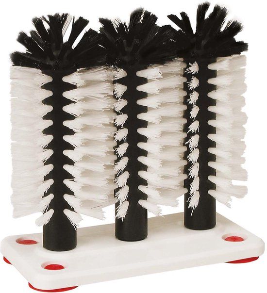 Spoelborstel voor het spoelen van jouw bierglazen. Door de drie borstels wordt jou glas aan zowel de binnen als de buitenkant gereinigd. De spoelborstels hebben een lengte van 18 cm. Plaats ze in een spoelbak met wat glasspoelmiddel en je hebt streeplo
