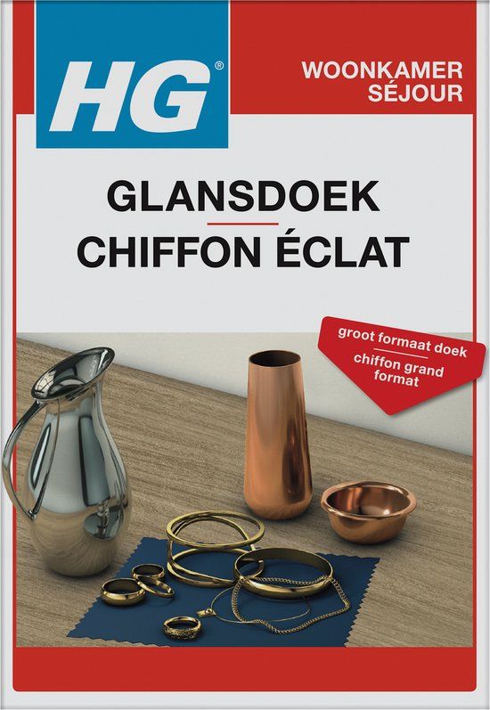 HG zilver glansdoek is een speciaal geïmpregneerde doek die zilveren of verzilverde voorwerpen makkelijk weer op glans brengt. HG zilver glansdoek is een geïmpregneerde doek gemaakt van een hoogwaardige textielsoort, die zelfs licht geoxideerde zilveren en verzilverde voorwerpen weer op glans brengt. Door het formaat hoeft het zilver niet met de blote handen aangeraakt te worden. Hierdoor wordt er een snelle heroxidatie door vingerafdrukken voorkomen.
