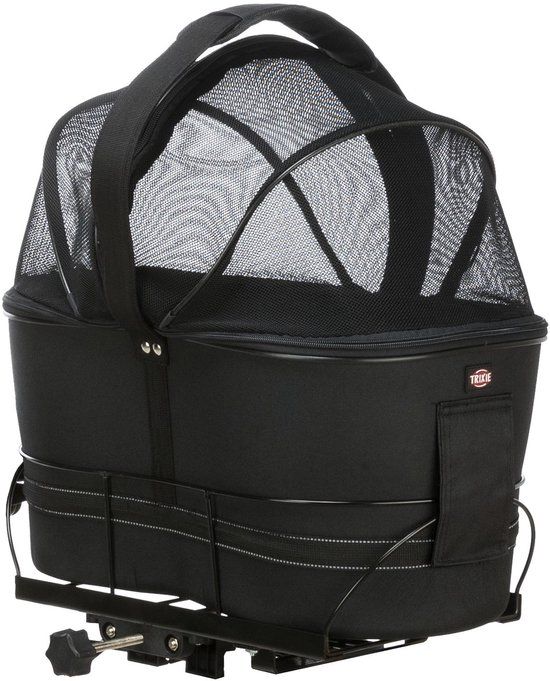- shape-retaining EVA\n- sturdy metal frame for safely transporting a pet on the bicycle rack (width 12–17 cm)\n- bag can be detached from frame due to Velcro fasteners and can be used as transport bag\n- net offers optimal protection, especially for active animals, and provides good air circulation\n- integrated short leash prevents the pet from jumping out\n- with reflective stripes\n- with removable padded plush inlay\n- colour: black