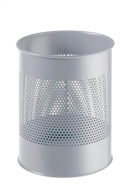 Ronde afvalbak met decoratieve perforatie rondom (165 mm breed), 15 liter. Voorzien van een krasbestendige laag epoxy polyester. Afmetingen (H x O): 315 x 260 mm.